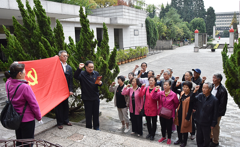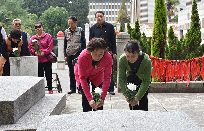 离退休党员们移步“12·1”烈士墓暨闻一多先生墓,手执白菊,向英烈们敬献鲜花、默哀鞠躬。在烈士墓前,展开鲜红的党旗庄严宣誓。